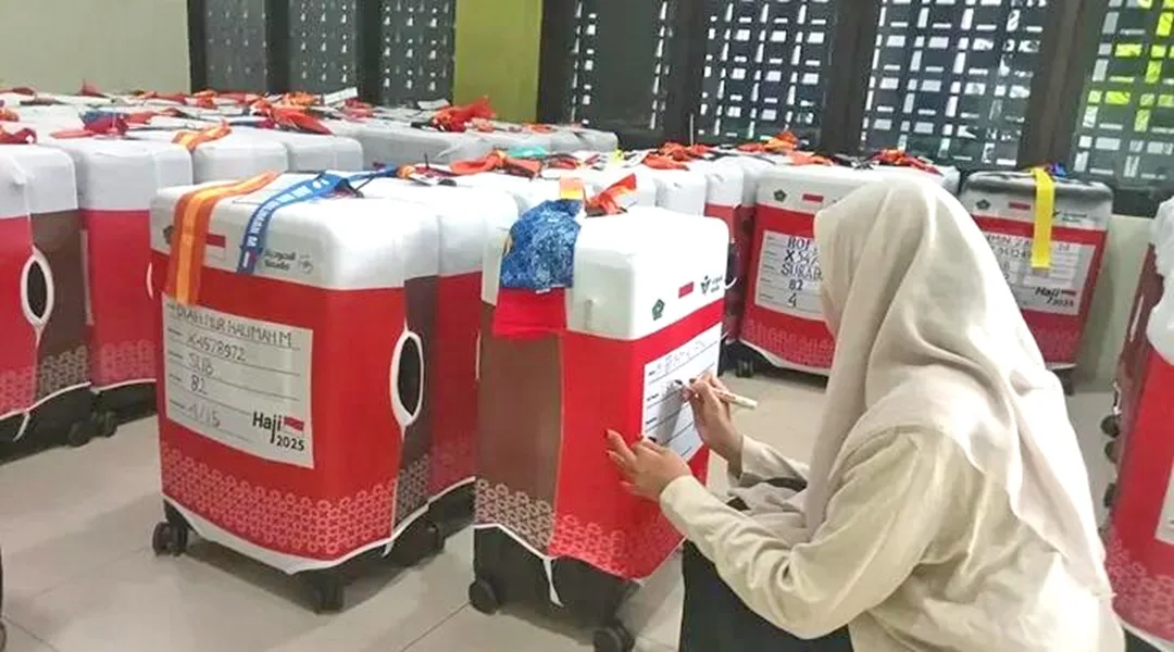 KOPER JEMAAH HAJI: Salah satu CJH menanda koper menjelang keberangkatan ibadah haji pada tahun 2025 lalu. MPM - KHALQINUS TAADDIN