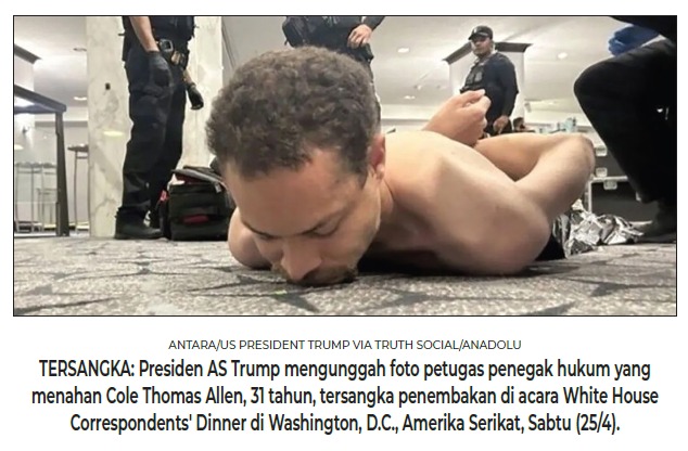 Terpisah, tersangka penembakan saat acara jamuan makan malam White House Correspondents pada Sabtu (25/4) malam mengaku mengincar pejabat pemerintah AS. Mengutip sumber penegak hukum, CBS News melaporkan pada Minggu bahwa tersangka, yang diidentifikasi sebagai Cole Allen, menyampaikan hal itu setelah ditangkap.